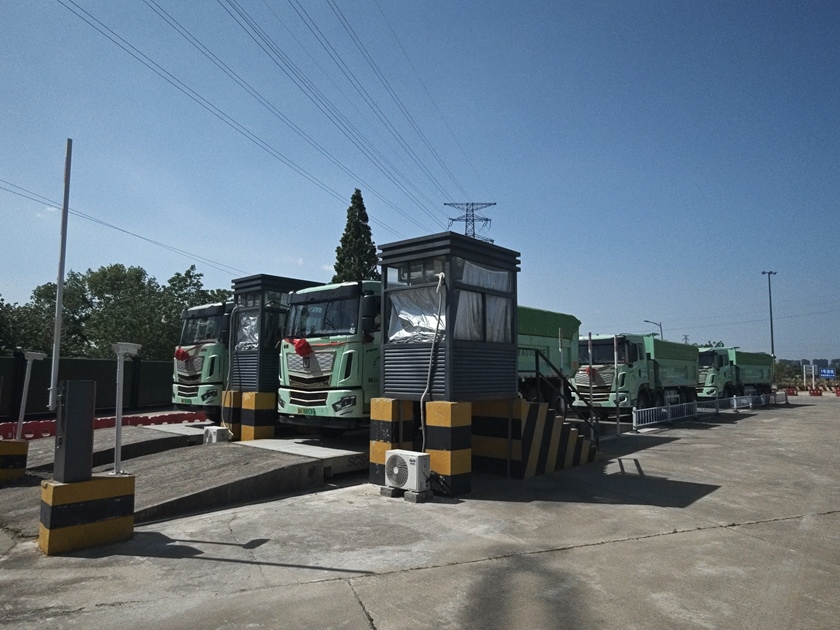 码头现场,渣土运输车辆有序进出,船舶规范装卸作业,码头运营安全高效。